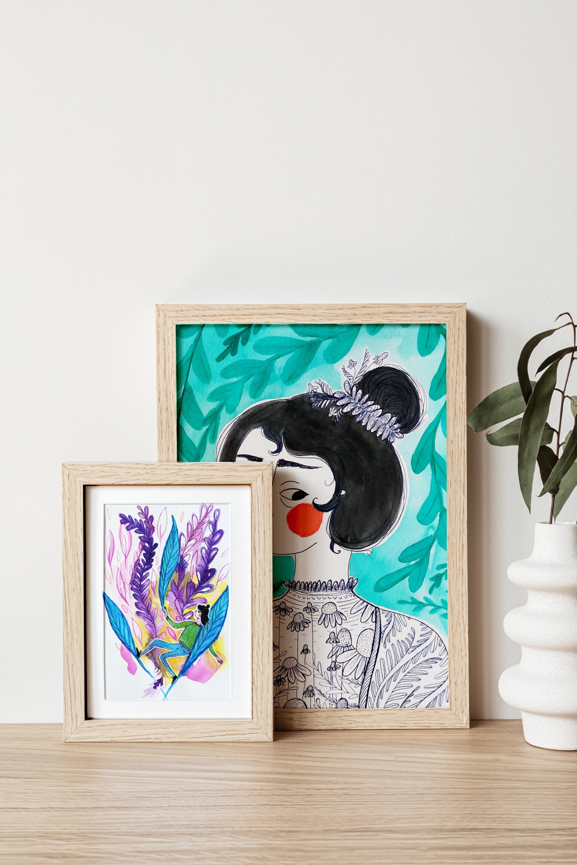 - Aquarel, kleurpotlood, fineliners en acrylmarkers op papier