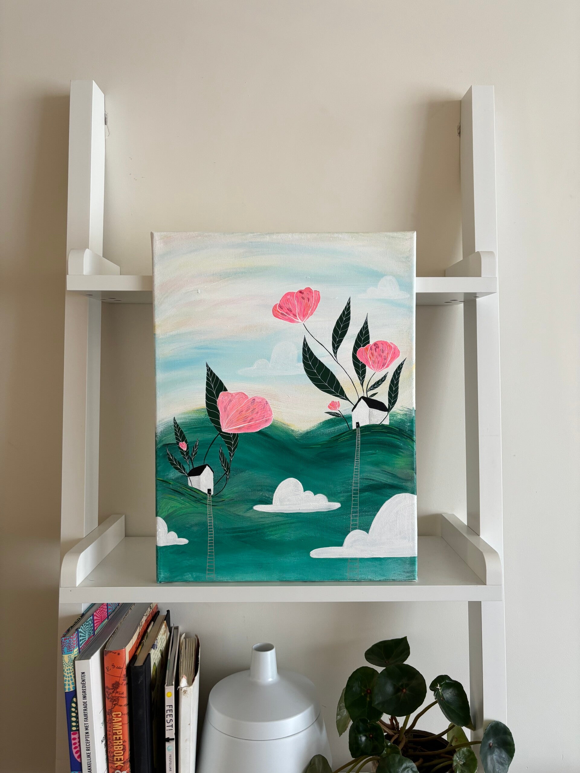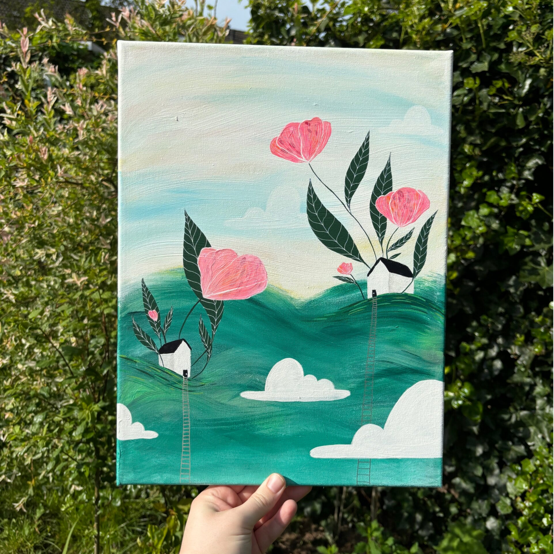 Voor ik begin, kies ik de kleuren die me op dat moment aanspreken voor de achtergrond. Daarna begin ik gewoon met schilderen! Eerst de achtergrond, dan steeds meer details tot ik weet wat het schilderij moet worden. Dit is compleet anders dan hoe ik mijn illustraties aanpak.