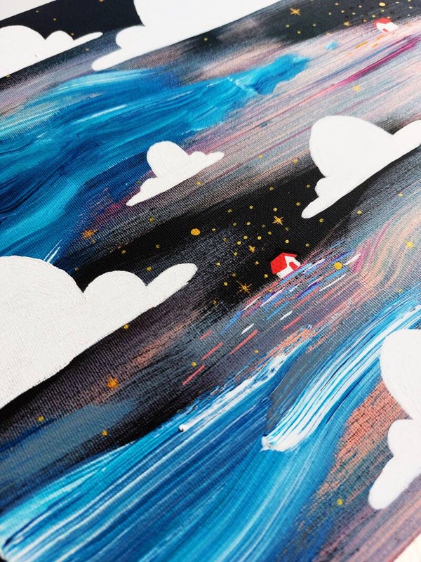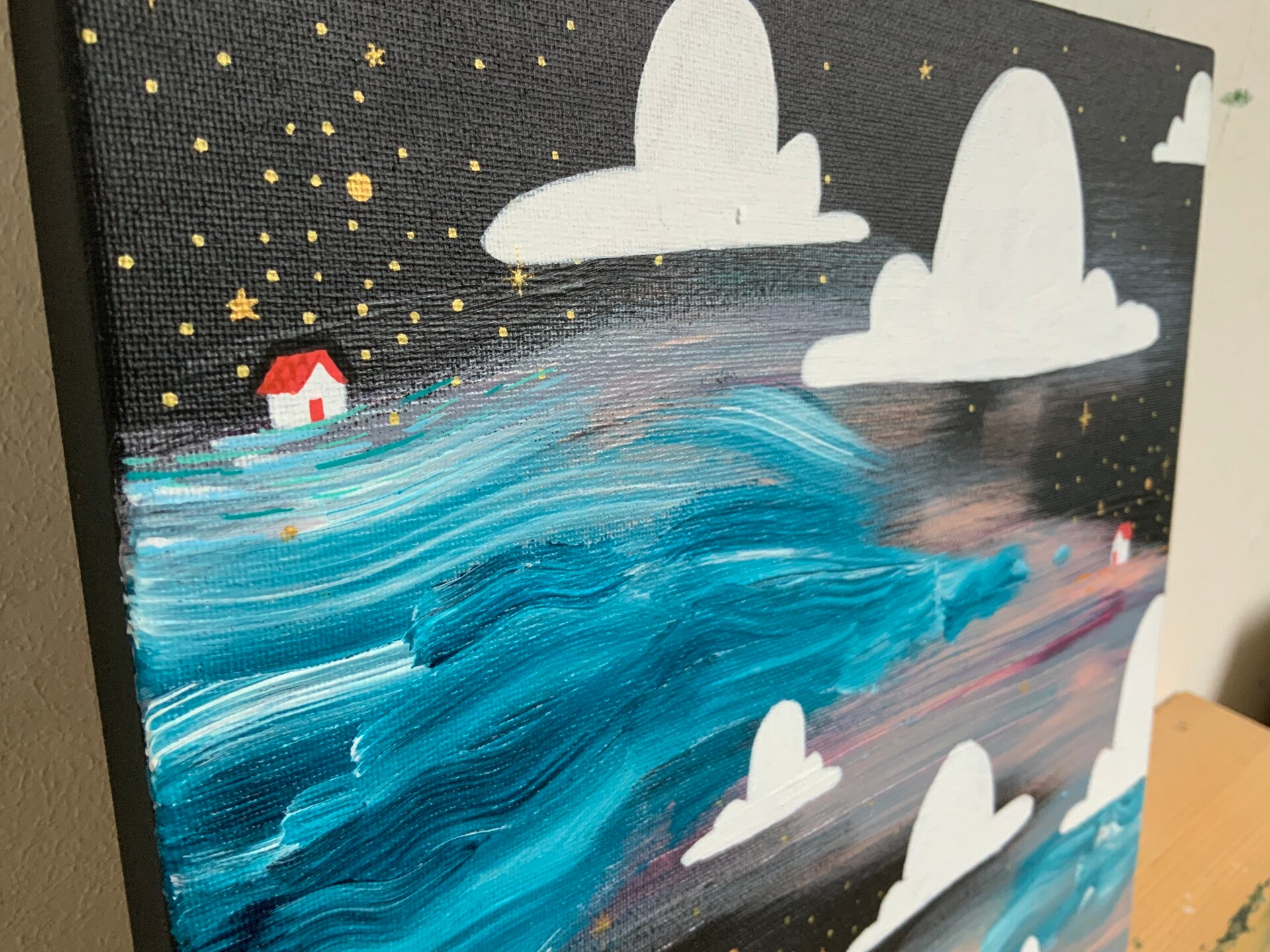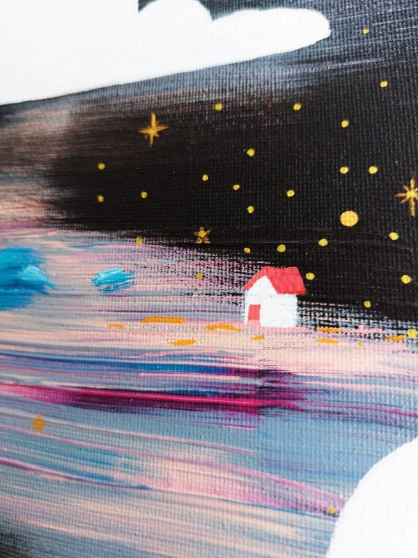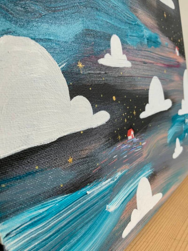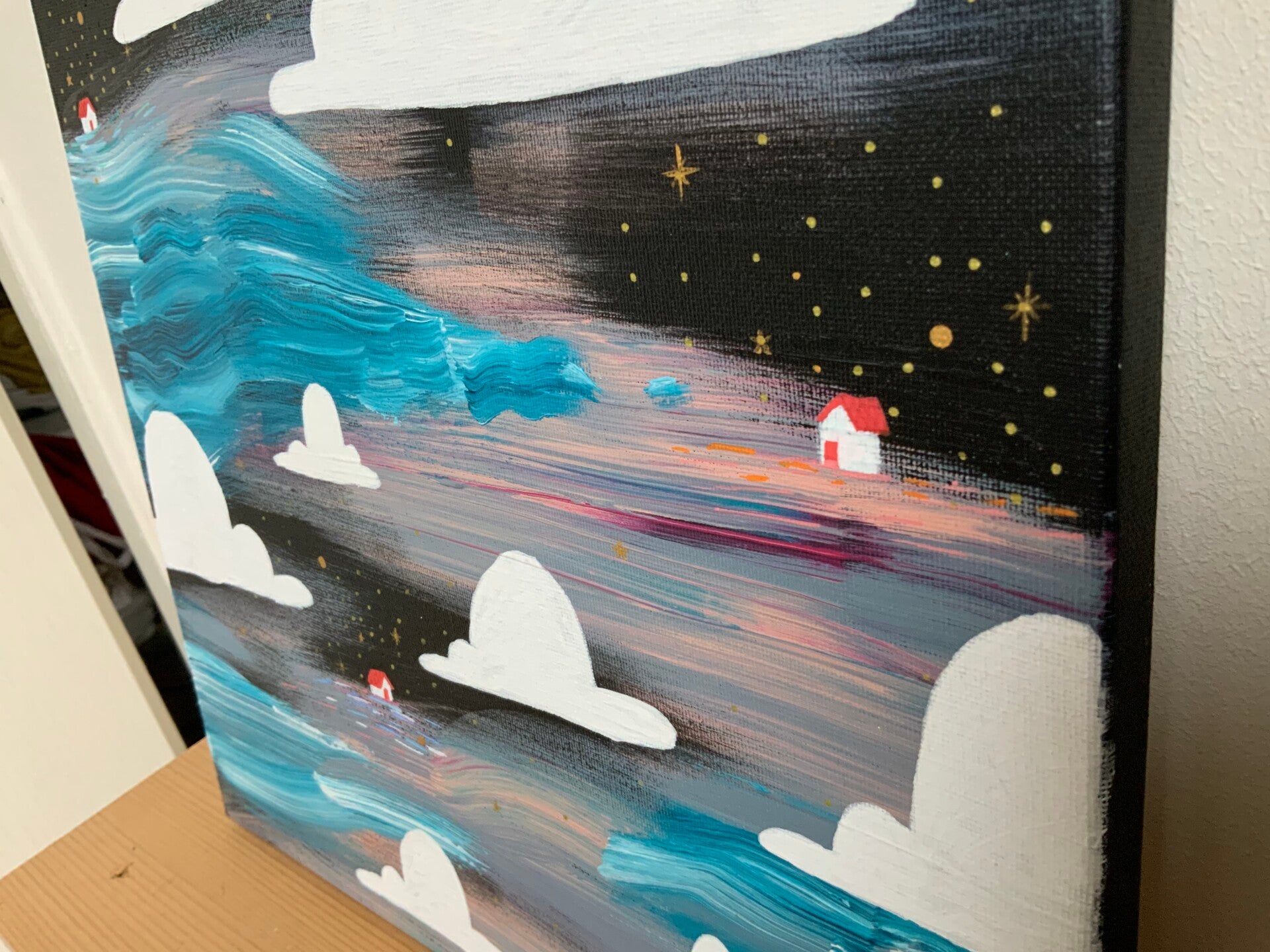 Voor ik begin kies ik de kleuren die me op dat moment aanspreken voor de achtergrond. Daarna begin ik gewoon met schilderen! Eerst de achtergrond, dan steeds meer details tot ik weet wat het schilderij moet worden. Dit is compleet anders dan hoe ik mijn illustraties aanpak.